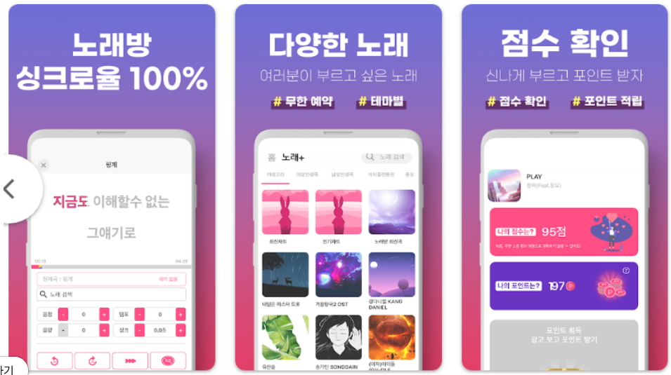 - 노래 부르기: 팝, 힙합, R&B, 트로트 등 다양한 장르의 곡을 선택해 가사와 함께 노래 가능